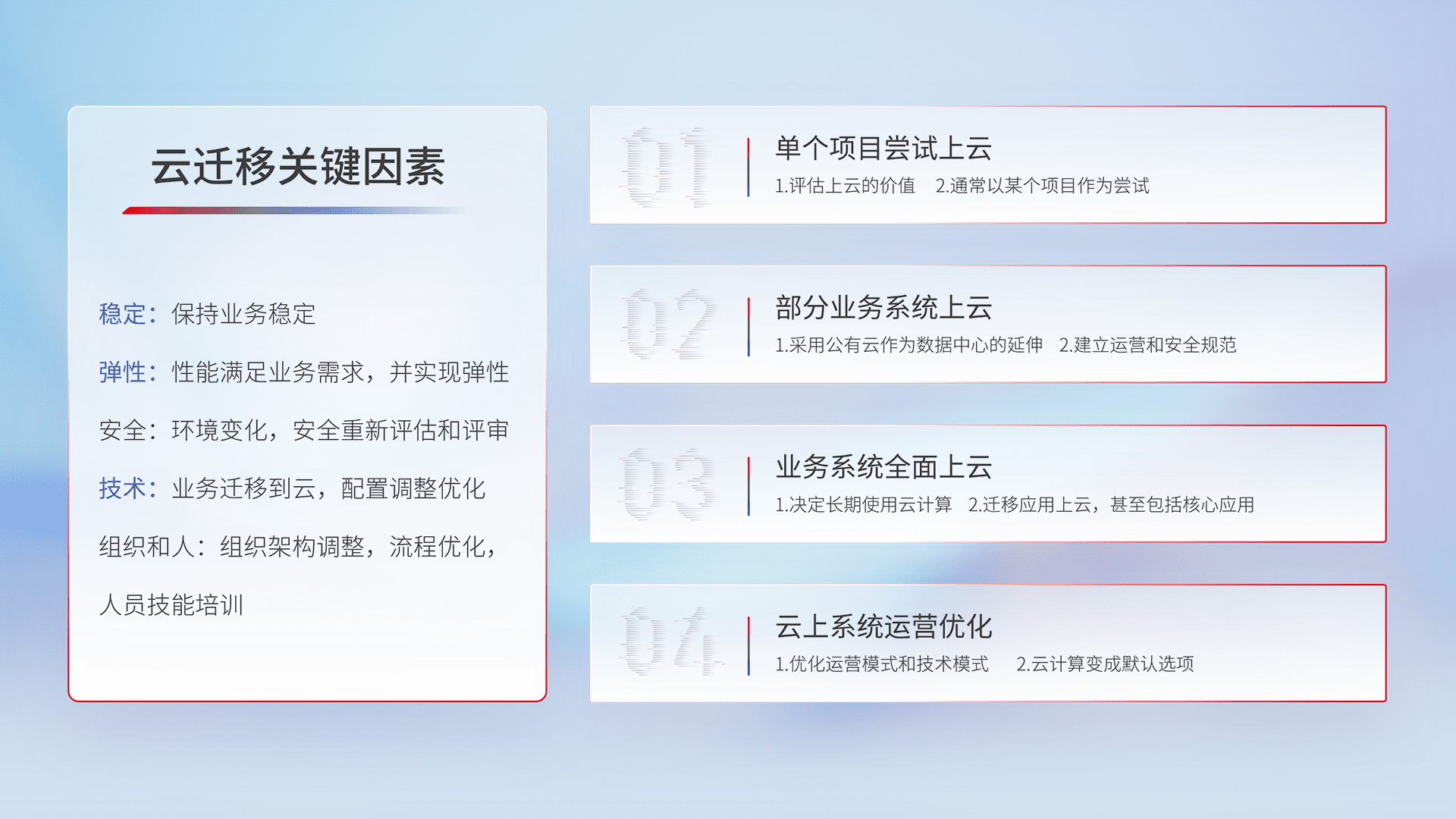 结合实际业务,,,,从规划设计、、、云平台选型、、、云原生改造、、数据迁移、、集成交付,,,迁移全过程为客户识别最佳上云路径,,做好风险识别管理,,,,设计网络架构、、、、身份权限、、安全审计合规、、、操作审计、、日志审计、、、、监控告警策略、、、、多站点容灾设计等,,,,对云上基础设施进行整体规划,,,提升IT治理水平,,,以满足弹性、、高可用、、、、高性能的需求。。。