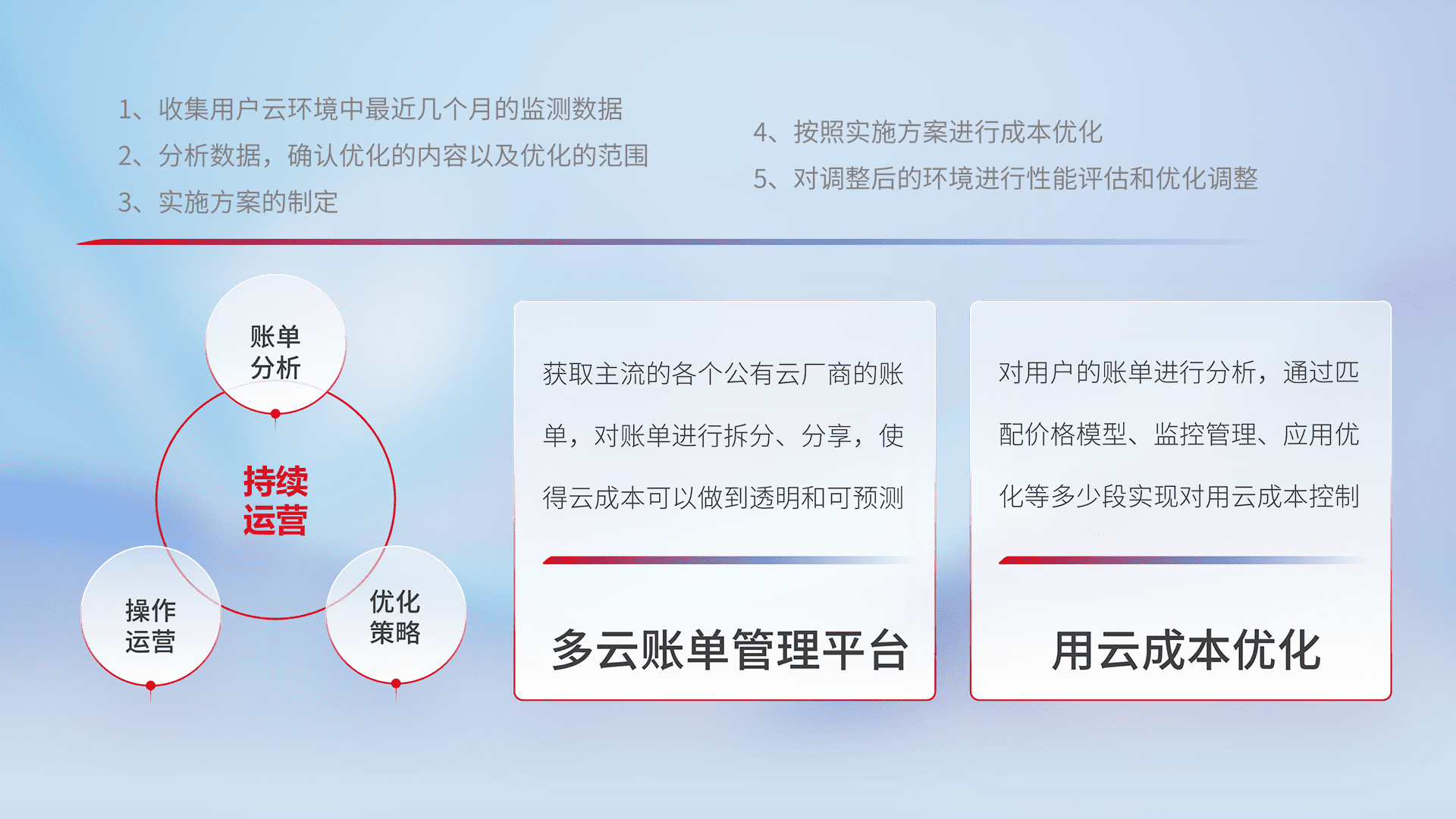 通过多云纳管,,以统一的资源数据模型把客户的云资源进行抽象和封装,,,,进而实现对多云资源的统一操作,,,,保障云资源管理的可靠性、、、、稳定性与可用性。。。。量身定制化运维内容,,,,配置、、开发运维、、、补丁管理、、、备份、、、监控、、认证和访问管理、、审计和日常巡检等,,,保障在用云过程中的可靠度,,,稳定度以及高可用率。。